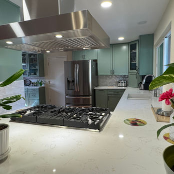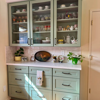 A Kitchen with Character: This stunning renovation features rich bluish-green cabinets that shift beautifully with the light, adding depth and personality to the space. By opening the kitchen to the dining room and incorporating a stylish standalone cabinet, Westland Renovations created a spacious, functional design that blends elegance with everyday comfort.